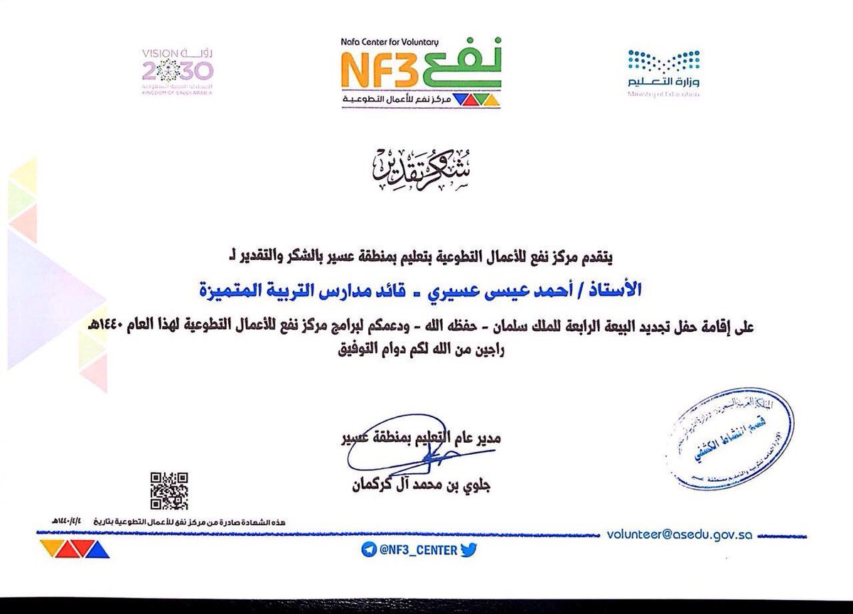 قائد مدارس التربية المتميزة يكرم بشهادة شكر وتقدير مقدمة من مدير عام التعليم الأستاذ جلوي بن كركمان نظير الجهود المبذولة على إقامة حفل تجديد البيعة الرابعة مدارس التربية المتميزة